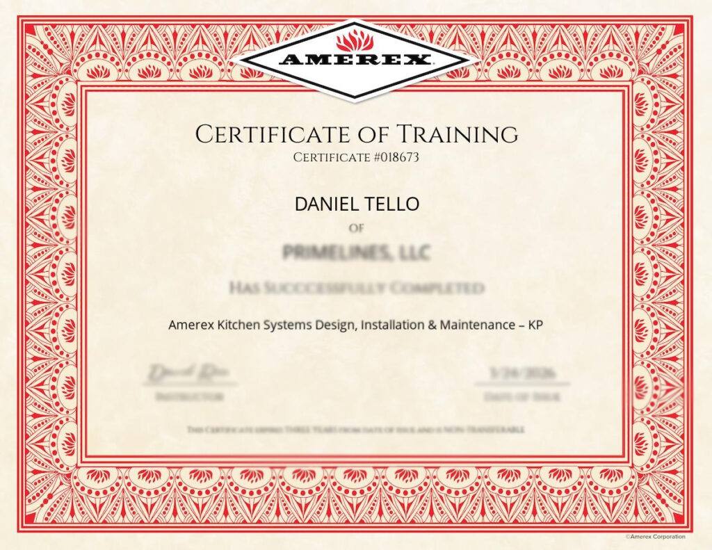 Contamos con la certificación oficial de AMEREX en Kitchen Systems Design, Instalation & Maintenance un respaldo internacional que valida nuestra capacidad técnica y operativa.